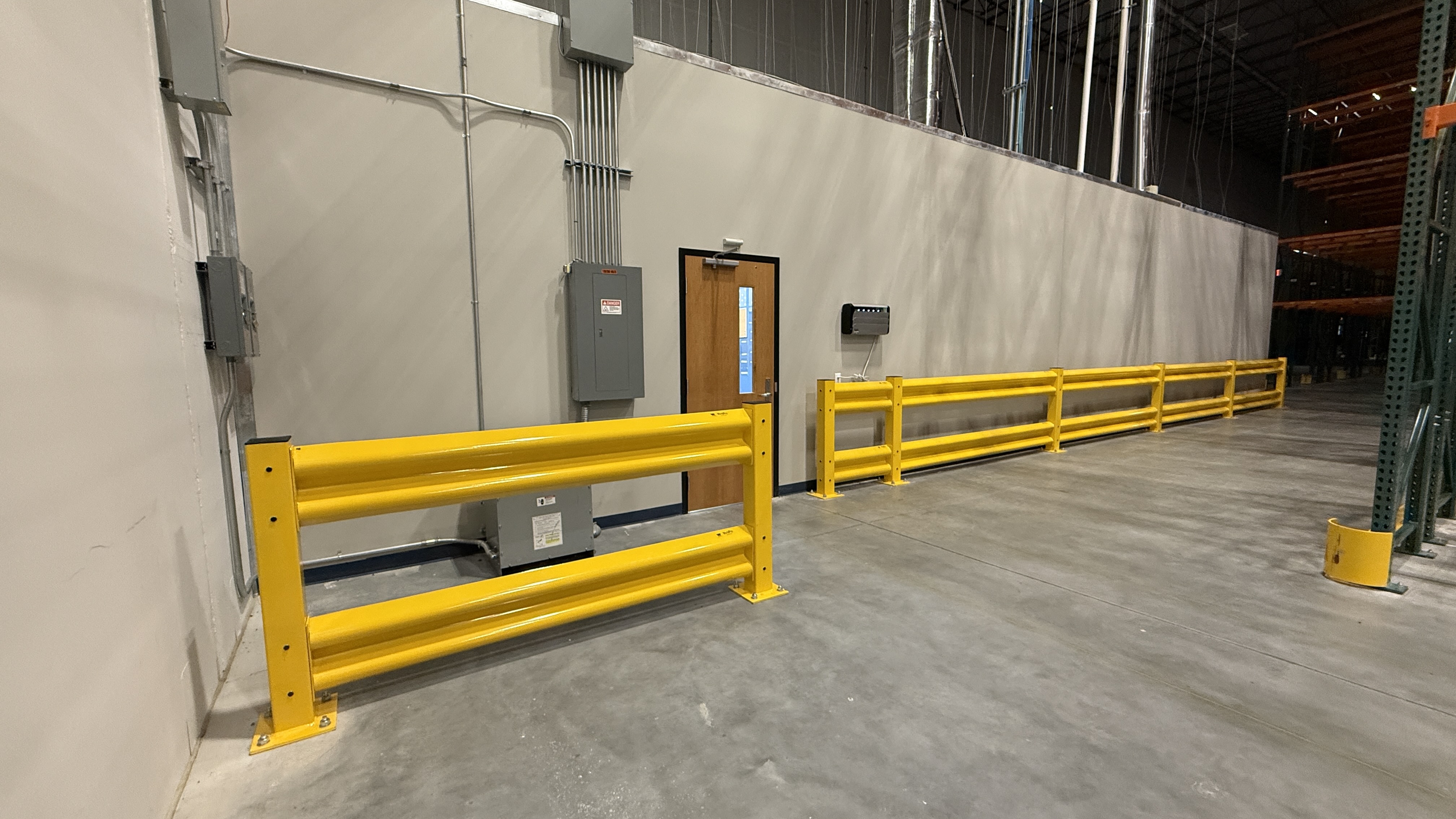 Guardrails are continuous steel rail systems anchored to the floor. Think of them as a connected series of bollards with a horizontal rail running between them. They protect longer runs and create defined traffic lanes.